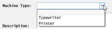 If any of your fields are defined as having default values, those default values will be pre-filled in for you. If you chose Add a Copy of Current Record, the data-entry window will have all fields, except for the ID #, filled in, with the values present in the currently selected record. Enter new values into the fields for the new record. You can use the <TAB> key to move from field to field. You can leave blank any field for which you have no data. Some fields (like Machine Type in the example shown above), may have picklists associated with them, in which case there will be a drop-down list of choices; click on the angle button (at the right end of the field) to access the picklist: