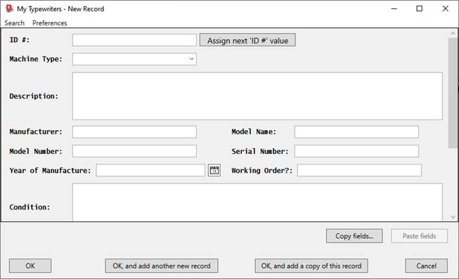 When you have finished entering data for the record click either OK, OK, and add another new record or OK, and add a copy of this record. If you click OK, and add another new record, the dialog will remain on the screen, but the fields will be cleared out (and fields with default values will be initialized with the appropriate default values), and the window will be scrolled to the first data-entry field in preparation for entering data for another record. If you click OK, and add a copy of this record, the dialog will remain on the screen, with all values unchanged, except for the ID # field, which will be cleared out (since it is expected that each record should have a unique value for its ID # field), or will be incremented to show the next ID # value, if you have the preference for auto-generating ID # values turned on (described below, under Notes). The OK, and add a copy of this record option is useful when you are entering a set of very similar items, as it allows you to enter the second and subsequent items as copies of the prior item, for which you then need only modify the few fields which differ from one item to the next.
