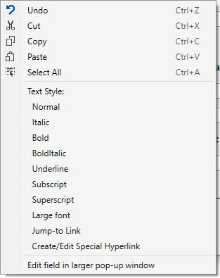 Some of the items in the menu may be disabled, depending upon whether text is selected in the field or whether there is any text on the Windows clipboard.