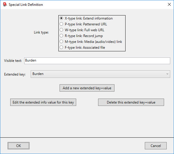 If you are working with an X-type link using an already-existing key (by choosing an existing key from the Extended Key dropdown list), two additional buttons will appear that let you modify the extended text (Edit the extended info value for this key) or delete the extended information key and value (Delete this extended info key+value).
