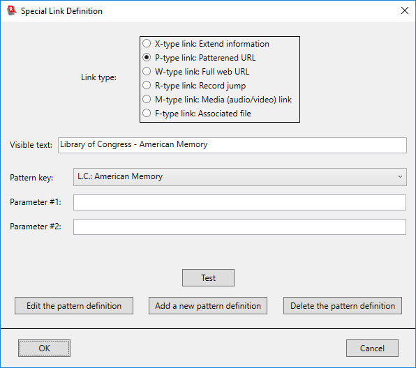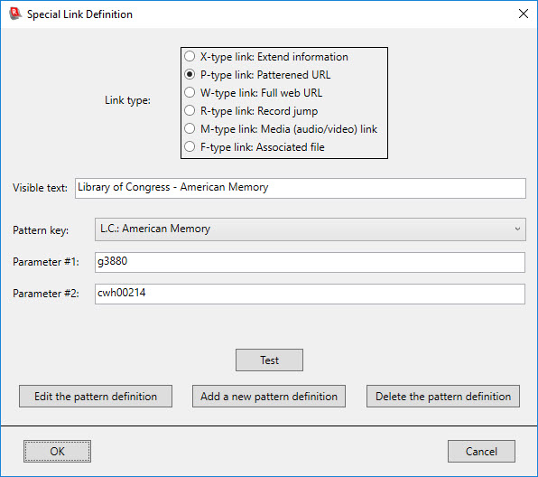 Creating P-type links is very similar to creating X-type links, except that in addition to specifying a key, you must also specify any required parameters. For example, suppose you had created the following pattern for a P-type link to the web pages at the Library of Congress’s American Memory web site: