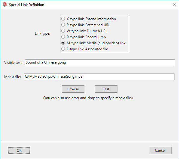 To create an M-link, select the M-type link: Media (audio/video) link radiobutton. Then enter the full pathname of the audio or video file that you want played when the link is clicked on. You can more easily provide the file name by clicking the Browse button and then navigating to and selecting the desired media file. You can also use drag-and-drop, by selecting a file in a Windows Explorer window, dragging it to the Special Link Dialog and dropping it into the Media file text-entry box.