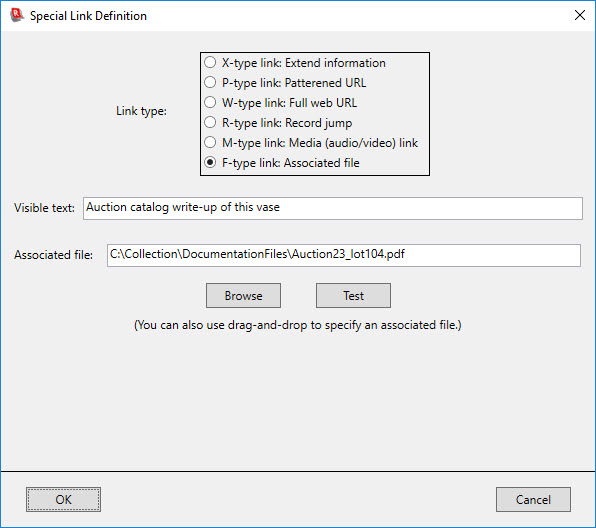 Once you have specified an associated file, you can use the Test button to verify that Recollector will do the right thing when the link is clicked on. The Test button performs the same action that will be performed when you click on the resulting hyperlink in the Item Details view.