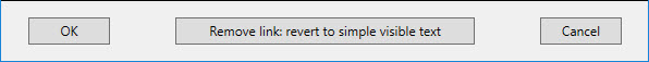 You can also remove an existing hyperlink by selecting part or all of the hyperlinked text in the editor, and then right-clicking and choosing Create/Edit Special Hyperlink from the options menu. In this case you will see an additional button at the bottom of the dialog: Remove link: revert to simple visible text. Click this button to remove the hyperlink: