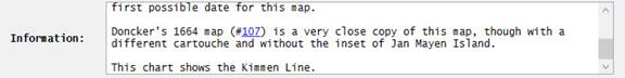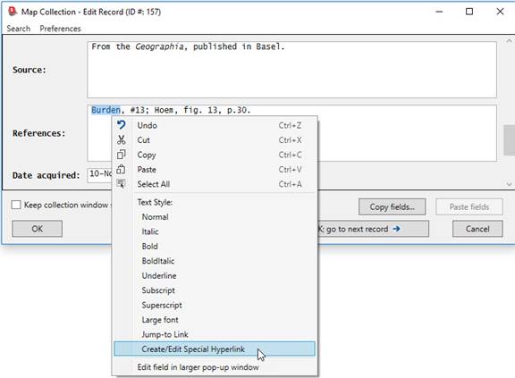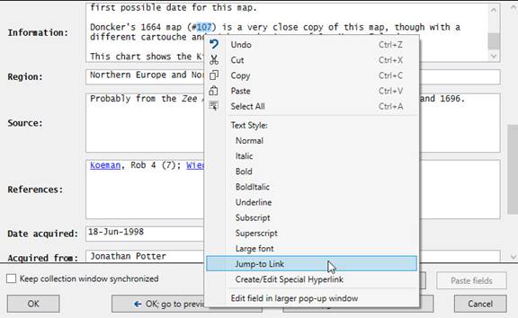 The Text style options (which will only be enabled if you have selected some of the text so that it is highlighted) let you add formatting capabilities to parts of the text. In addition to italics, bold, bold+italics and underlining, you can increase the font size of the selected text [Large font] or you can turn the selected text into subscript or superscript text. (These various text styles are mutually exclusive; you cannot combine, for example, bold and superscript.) The Jump-to Link choice lets you create a hyperlink to another record in your collection database. As an example, the following illustration shows part of the window, with an entry in a multi-line field named Information that includes a reference to another record (#107) in the collection database: