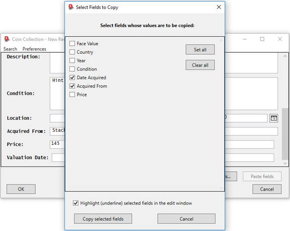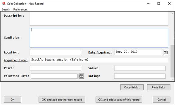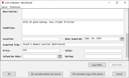 When you have finished entering data for a new record, you can click the OK, and add another new record button if you want to proceed immediately to data entry for another new record. In certain situations you may want to add a number of new records, where some of the fields have exactly the same value across all of the new entries. For example, if you just acquired eight new coins for a coin collection, all acquired at the same time at the same coin auction, then the information about the source will be the same for all eight new records. One option is to use the OK, and add a copy of this record button, which will maintain all the field values (other than the ID # field), and then make changes for the subsequent records. If, however, you only want to preserve the values for a subset of fields as you go from one new record to the next, you can copy the values from the first added record and subsequently paste the values, all at once, into the subsequent seven records. The Copy fields and Paste fields buttons provide the means to do this.