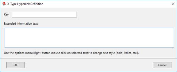 If you are creating an X-link (footnote-style extended information), then you simply need to use the drop-down list to choose the key associated with the extended information text. If you have not yet created a new key and value for the desired extended text, click on the Add a new extended key+value button. This will bring up the following dialog: