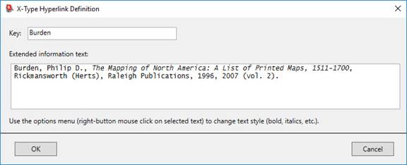 Note that in this example the key chosen (“Burden”) happens to be the same as the visible text (see earlier illustration). This is not required, but it is both sensible and convenient to choose keys (for both X-links and P-links) that match the associated visible text. It is particularly convenient because when you invoke the Special Link dialog, the program examines the provided visible text, and it then searches the already-created X-link and P-link keys, looking for a key that is likely to be the intended association to the visible text. If it finds a likely key, the dialog is initially shown specifying that key. This makes creating new links on existing X-link and P-link keys very quick, since the Create Special Link dialog will be pre-set to the correct settings. For the X-link case, you need only click the OK button. (As described below, for the P-link case you will need to specify the parameter values and then click OK.) When generating printed reports, there is an option to include a list of references as an additional section of the report. This refernce list is generated from the X-links found in the information printed in the main part of the report, but it is limited to those X-links for which the visible text matches the key. This is another good reason to choose keys which match the visible text.