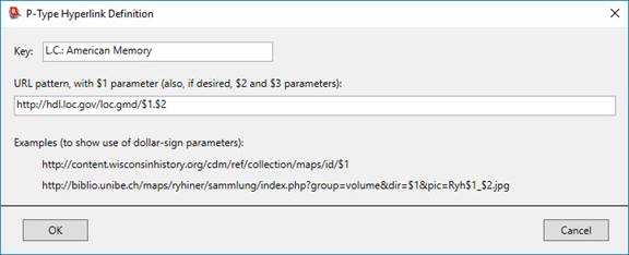 you can select the Library of Congress – American Memory section of this text and then right-click and choose Create/Edit Special Hyperlink from the options menu. Click the P-type link: Patterned URL radiobutton, and choose LC – American Memory from the dropdown list. After these steps the dialog will look like this: