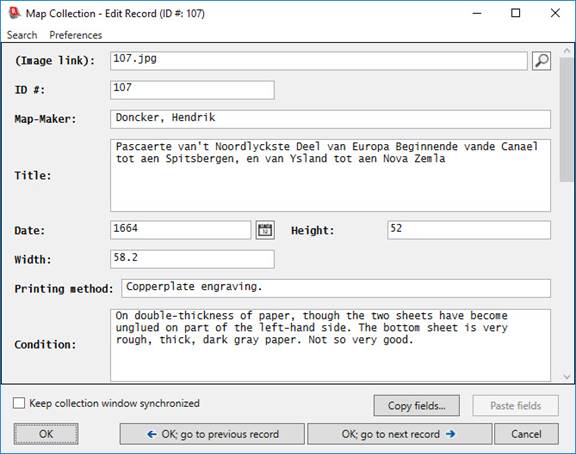Any changes you make will be applied to the data fields when you click OK. Alternatively, you can click on OK; go to previous record or OK; go to next record and the data-editing window will stay in place, but the contents will be changed to reflect the prior or subsequent data record of the collection window. In any of these cases, the changes made in the data-entry window will be immediately reflected in the collection window.