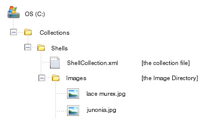 In the example shown above, the collection file (ShellCollection.xml) is in the C:\Collections\Shells folder. The Image Directory (the folder named Images) is also located in the C:\Collections\Shells folder. By placing the Image Directory folder into the same folder that contains the collection file, Recollector is able to locate images via their location relative to the location of the collection file. The primary advantage of this is that it guarantees that your entire collection can be relocated (to a different location or disk on your computer, to a movable USB thumb drive, or to a different computer) without having to make any changes to your collection. Consequently, we strongly recommend that you follow these guidelines, and, when defining the specification for your collection’s Image Directory, the program makes it easy for you to do this.