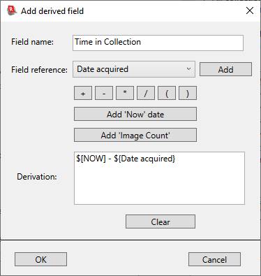 Enter a name for the new field. The name must be different from the names of any other fields (whether ordinary or derived). Then enter a formula in the Derivation text box. Except for constant values, the text in the Derivation box can be supplied by interacting with the controls in the dialog. To enter a field, choose the field name from the dropdown list and click the Add button. (Note that only date, number, currency, and dimension fields appear in the dropdown list. Text fields, image fields and other derived fields are not available for use in derived field formulas.) In the Derivation box, a field reference is represented by a dollar sign followed by the field name within curly braces. For example, a field named Value would appear in the derivation as ${Value}. Enter arithmetic operators by clicking on one of the four operator buttons (+, -, * and /). To represent the current date, as a date value, click the Add ‘Now’ date button. This will appear in the Derivation box as $[NOW]. You can also represent the number of images associated with a record by clicking on the Add ‘Image Count’ button. This will appear in the Derivation box $[NUMIMAGES]. To enter a numeric value, simply place your cursor in the Derivation box, where you want the number to appear, and type in the value. Numeric values can be simple integers (for example 12) or numbers with fractional parts (for example, 0.25). Negative numeric values are not supported, though you can usually get the effect of negative numbers by preceding the number by the minus (-) operator.