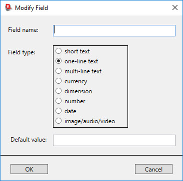 If you later want to change either the name or the data type of an existing field, select it from the list on the Modify Fields dialog and click Modify. The program will display the same dialog box as shown above, but it will be filled in, with the current name, type, and default value for the field. Make any desired modifications and click OK.
