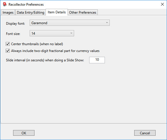 Recollector lets you control certain aspects of its behavior via a Preferences dialog. This is accessed via the Preferences choice on the Options menu. The Preferences dialog is a tabbed dialog. Select the tab at the top to access preference choices related to different aspects of the program. Preferences apply to all your collections. So, when you bring up the Preferences dialog from one collection window, all the choices you make will also apply to any other collection window that is open or that is subsequently opened.
