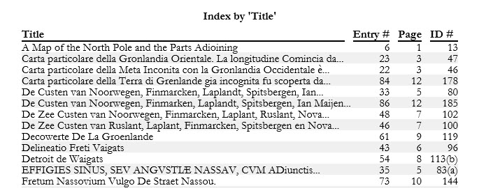 If you want your report to contain indexes, specify that here. Each index will be in the form of an alphabetized list, one line per entry, showing the value of the chosen index field, along with the corresponding entry number in the report and the page of the report on which the entry begins. (Each entry in the report is numbered in the left-hand margin, as can be seen in the example at the top of the page.) You can also request that the index show the value of the ID # field (in addition to the index field and the entry number). The following image shows part of a page containing an index: