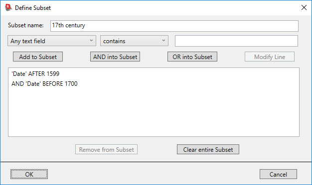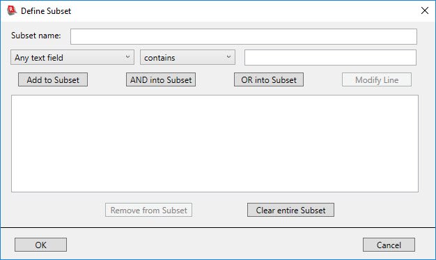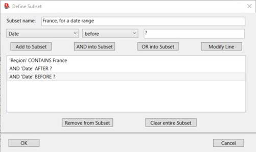To modify a line of the subset specification, select it in the list, edit the terms of the condition at the top, and then click the Modify Line button.