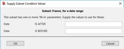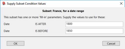 When you select this France, for a date range subset from the Select a Subset menu, Recollector will prompt you to fill in the values for the two conditions that have ‘?’ values in the subset definition: