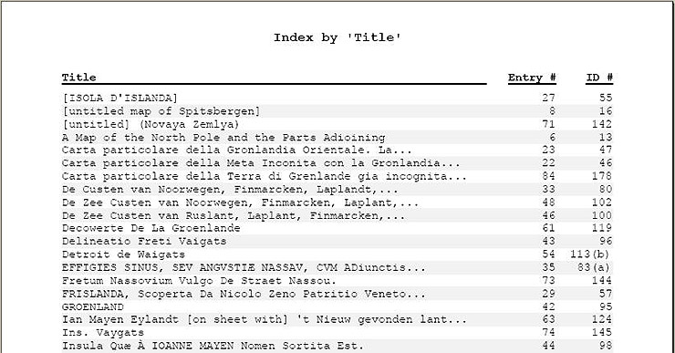Each index will be in the form of an alphabetized list, showing the value of the chosen index field as well as the entry number in the report. (Each entry in the report is numbered in the left-hand margin, as can be seen in the examples at the top of the page.) You can also request that the index show the value of the ID # field (in addition to the index field and the entry number). The following image shows part of a page containing an index:
