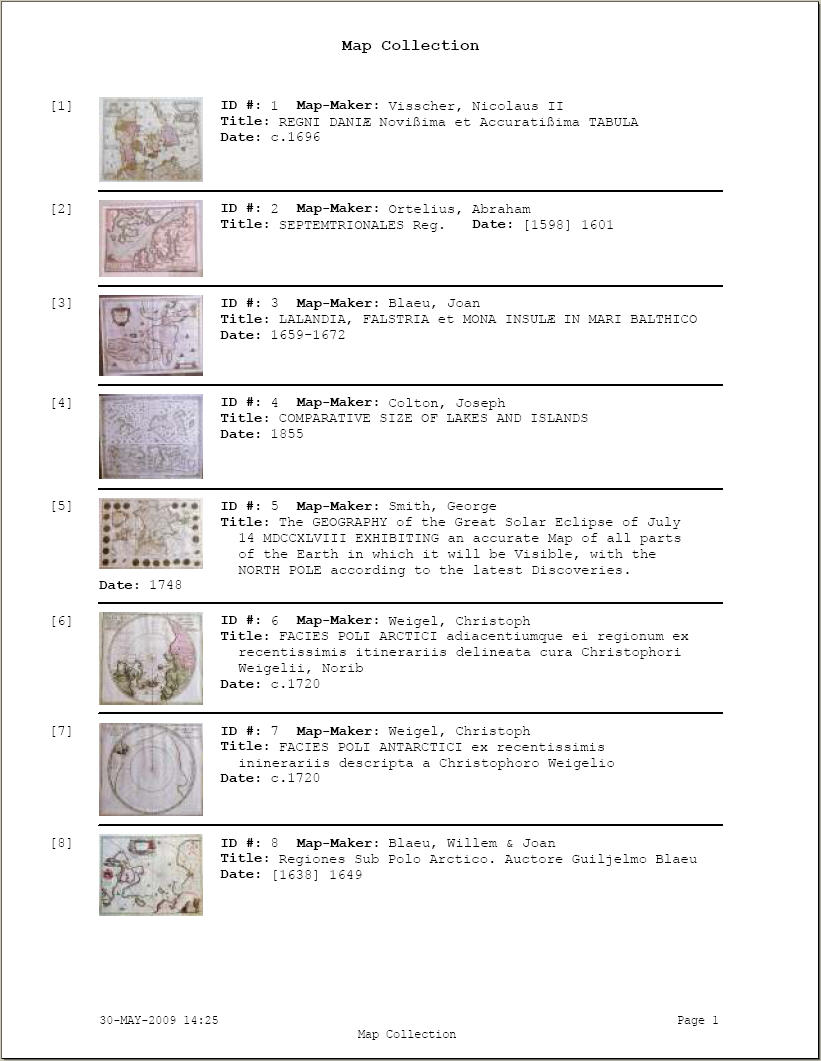 There are times when you want to have a printed listing of your collection, ideally in the form of a compactly printed report that summarizes either your entire collection or a subset of your collection. For example, if you are at a show or an auction, and it is inconvenient to have your computer with you, a printed listing of your collection can be helpful to remind you of what you have (and what you don't have). Or, as an attachment to an insurance policy, a printed listing can provide valuable back-up, containing supporting information when filing a claim.