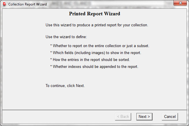 As of version 1.1.19, the Recollector contains a Report Generation Wizard that makes generating customized printed reports a snap. If you are a current customer, choose About Recollector from the Help menu. This will show you your current version number. If it is less than 1.1.19, you should first upgrade to the latest version. (Click here for instructions on how to update to the latest version.)