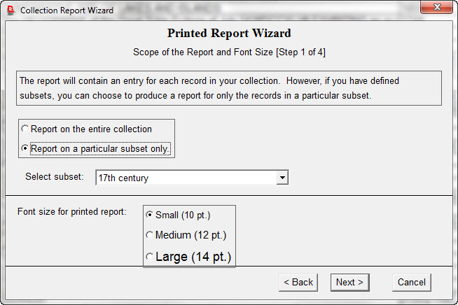 Choose whether your report will cover your entire collection, or just a specified subset. You can also choose the font size that will be used in printing your report.