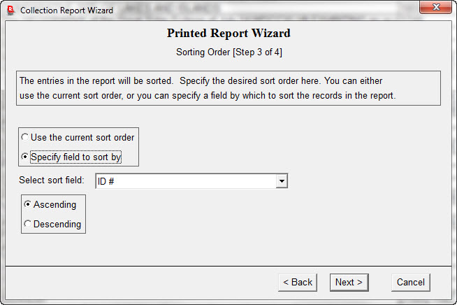 Choose how you want the entries in the report to be ordered. You can either use the current sort order of the List View, or you can choose any field as the sorting field (whether or not the field is one of those selected for inclusion in the report entries), as well as choosing ascending or descending order.