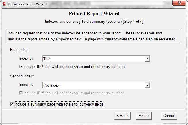 If you want any indexes to be appended to your report, specify it here. Also, if you want a currency-field summary page included as part of the report, turn on the checkbox at the bottom of this page of the wizard. The currency-field summary page will list totals for all fields that are included in the report whose data-type is "currency".