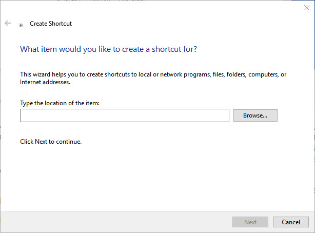 Create a new shortcut on your Desktop. To do this, right-click on the Desktop and choose New > Shortcut. This will bring up the following window: