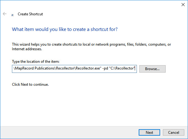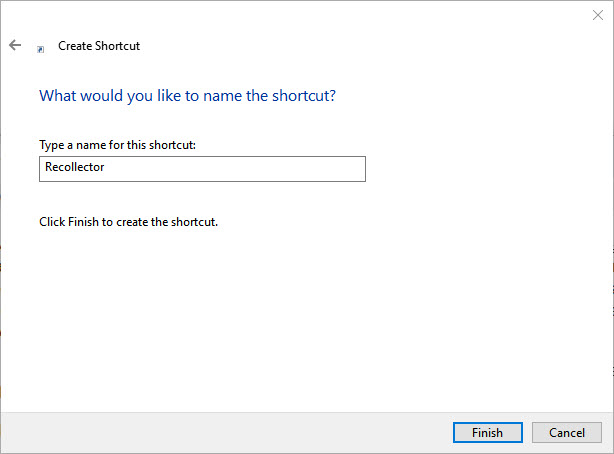 Click the Next button and you will be asked to give a name to the shortcut. The suggested name will be Recollector.exe. Get rid of the ".exe" ending, and just specify a name of Recollector: