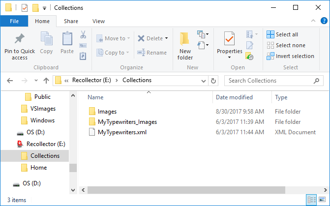 (Note that the Images folder is still in the Collections folder, since it was created there when the thumb-drive installation of Recollector was done. However, in this case, that Images folder is not used for the typewriter collection, whose images are all in the MyTypewriters_Images folder that was copied to the thumb drive, along with the MyTypewriters.xml collection file, from the hard disk.)