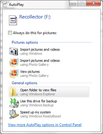 When you install Recollector to a thumb drive, no desktop icon is created for starting the program. Instead, there is a batch file, Run_Recollector.bat, at the top level of the the thumb drive. You can run Recollector by double-clicking on this batch file. In addition, depending upon what version of Windows you are running, and how you have your auto-run settings configured, each time you insert the thumb drive into a computer's USB port, the Windows system may start up an auto-run menu that will look like the following image (though the name of USB device will likely be something other than "Recollector" shown in this image). Click on the Open folder to view files option to see the files on the thumb drive.
