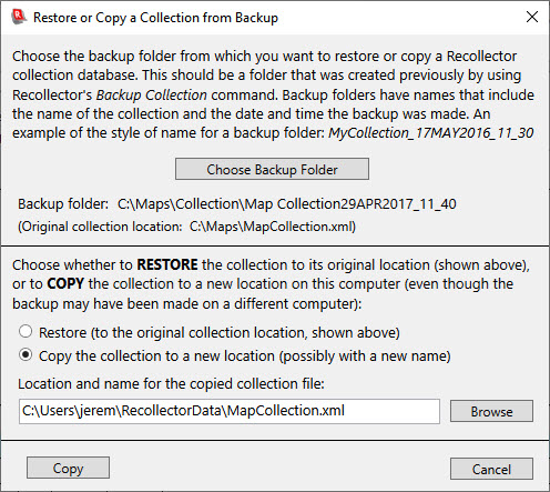 Secondly, in the lower part of the dialog, switch the choice from Restore to Copy. Then specify where the copied collection database should be placed. Here there is a small difference between the PC and Mac versions: