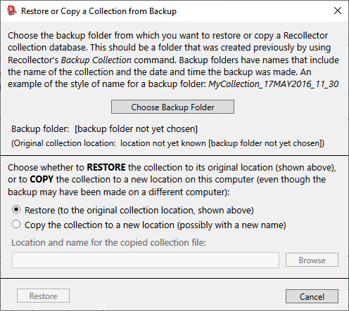 The next step is to copy your collection from the backup onto your new computer. If your Recollector backup is stored on a USB thumb drive, insert that thumb drive on the new computer. Choose Restore or Copy a Collection from Backup on Recollector's File menu. This brings up the following window: